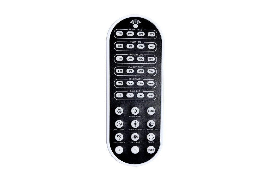 The CSC LED MS04-RC is a handheld infrared remote designed to quickly program and fine-tune HB01DMS-B motion sensors on compatible CSC LED fixtures. It allows installers and facility managers to adjust detection range, time delay, dim levels, and daylight thresholds from the ground – without opening fixtures or accessing wiring.